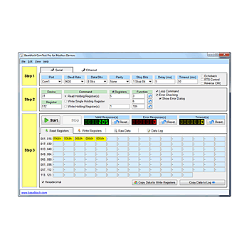 This complementary program allows users to test and troubleshoot Modbus RTU and Modbus TCP communication by sending single or multiple read or write commands to the connected device. The software offers comprehensive data-logging, data-formatting and error checking features.